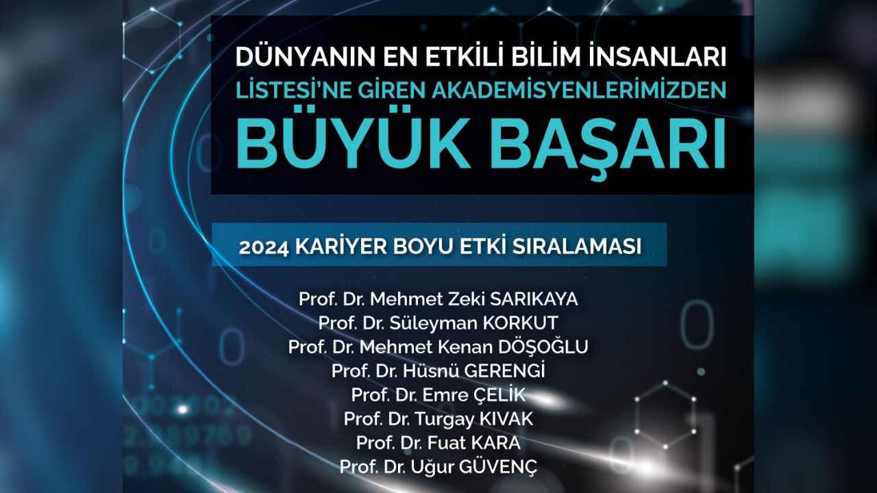 “Dünyanın En Etkili Bilim İnsanları”nın Kariyer Boyu Etki Listesi’nde ise; Prof. Dr. Mehmet Zeki Sarıkaya Genel Matematik alanında 47, Orman Fakültesi Öğretim Üyesi Prof. Dr. Süleyman Korkut Ormancılık alanında 438, Prof. Dr. Mehmet Kenan Döşoğlu Elektrik ve Elektronik Mühendisliği alanında 2014, Prof. Dr. Hüsnü Gerengi Polimerler alanında 2687. sırayı alarak Düzce Üniversitesi’ne önemli başarılar kazandırdı. Prof. Dr. Emre Çelik Enerji alanında 3517, Malzemeler alanında Prof. Dr. Turgay Kıvak 3707, Prof. Dr. Fuat Kara 4420, Yapay Zeka ve Görüntü İşleme alanında ise Prof. Dr. Uğur Güvenç 7279. sıra ile küresel başarı hanesine adını yazdırdı.Düzce Üniversitesi tarafından yapılan açıklamada, “Her yıl Dünyanın En Etkili Bilim İnsanları Listesi’ne giren ve Üniversitemizi gururlandıran akademisyenleri tebrik ediyor, başarılarının devamını diliyoruz.” ifadelerine yer verildi.
