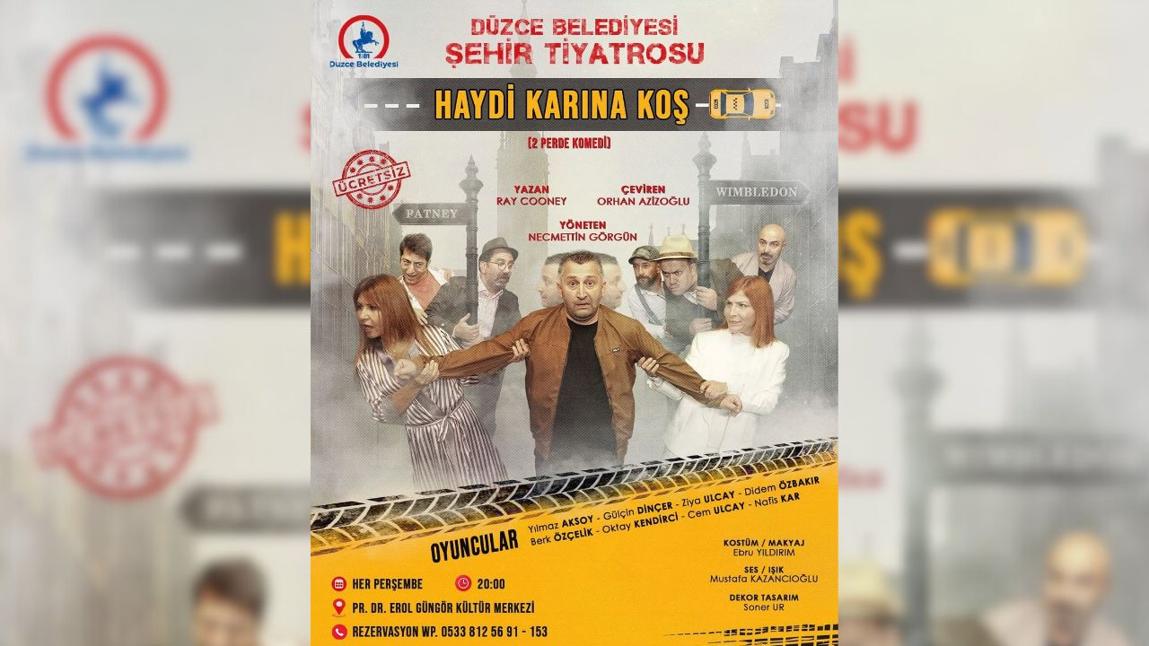 Düzce’de kültür ve sanat hayatı, Şehir Tiyatrosu’nun yeni oyunuyla canlanıyor. “Haydi Karına Koş” adlı oyun, 16 Ekim Perşembe günü Prof. Dr. Erol Güngör Kültür Merkezi’nde sahnelenecek. Oyun, her Perşembe akşamı ücretsiz olarak tiyatroseverlerle buluşacak.