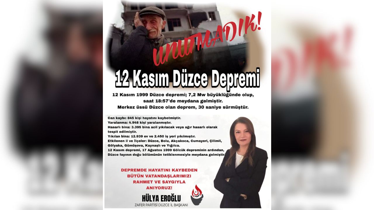 Mesajda, depremden çıkarılacak derslerin önemine de vurgu yapılarak, şehrin geleceğinin güvenli ve planlı bir şekilde inşa edilmesi gerektiği belirtildi. Zafer Partisi Düzce İl Başkanlığı, Düzce’nin geçmişini unutmadan, geleceğini daha güçlü kılmak için çalışmalarını sürdüreceklerini duyurdu.